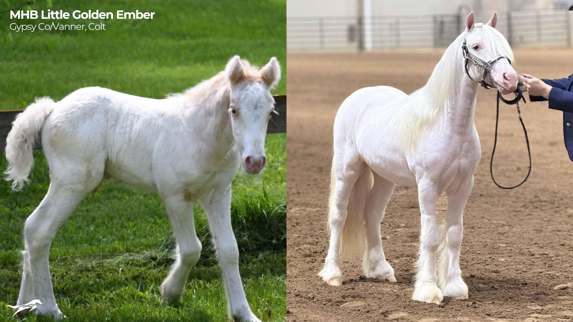 MHB Little Golden Ember at a few months old after his recovery (left image) to winning National Reserve Champion Yearling Colt at Nationals 2025 (right image).